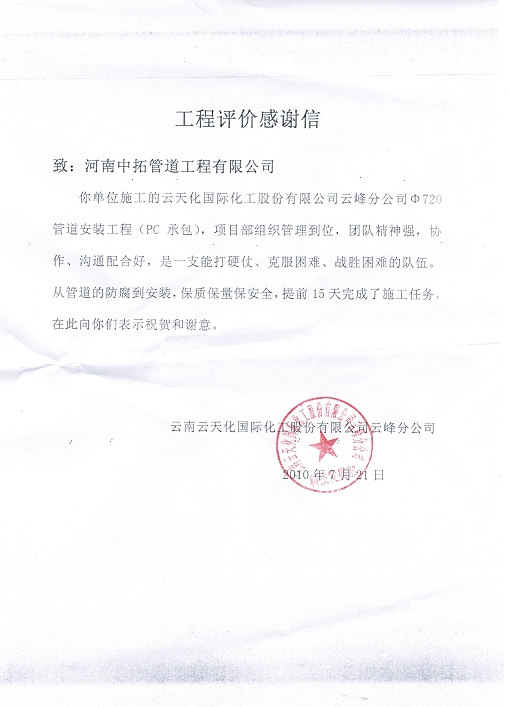 云峰公司感谢信: