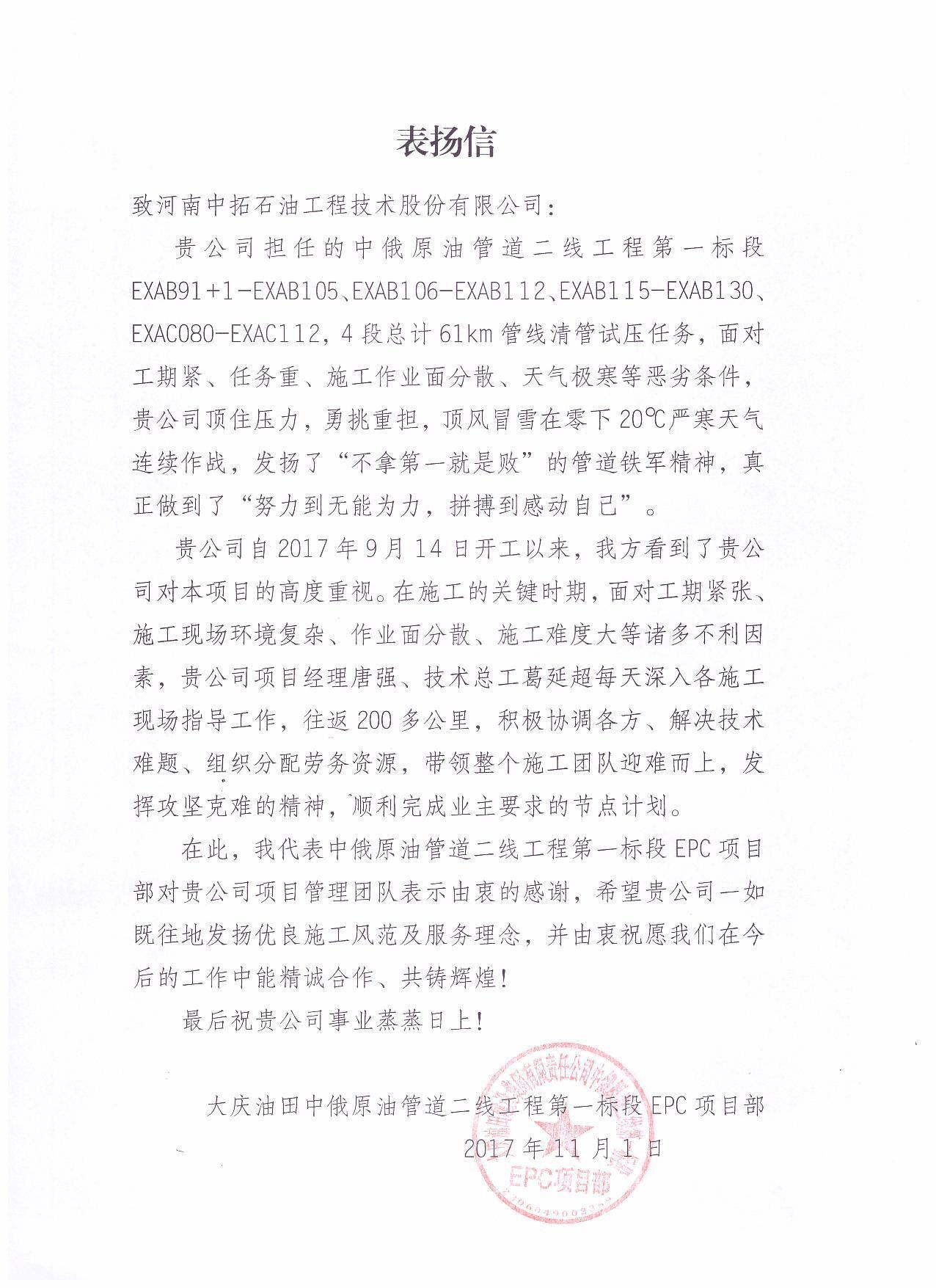 自2017年06月项目开展以来,面对施工段落跨度大、缺乏水源、施工作业分散、天气极寒等恶劣条件,全体项目人员在公司技术总工葛延超、项目经理唐强、何新才带领下群策群力、精诚协作、昼夜奋战、攻难克艰,战风雪斗严寒,出色的完成了施工任务,一、四标段都得到了业主单位的高度好评。项目全体人员对待每次施工都能够做到及时响应、精心组织、科学管理、文明施工,实现了现场标准化管理;这不仅展现了我公司的优良传统和员工的良好风貌,也充分体现和发扬了“中拓精神”,同时也为国家石油管道建设增光添彩。
