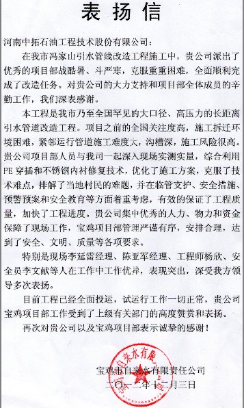 我公司宝鸡项目部综合利用PE穿插和不锈钢内衬修复技术,优化施工方案,克服技术难点,做好预警预案,有效的保障了工程质量与进度。目前该工程试运行工作一切正常,宝鸡项目部工作受到宝鸡市自来水有限责任公司的一致肯定与赞赏。