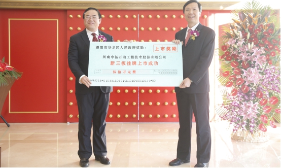 仪式现场,濮阳市华龙区人民政府为奖励安博官网新三板上市成功,特此奖励50万元,由徐慧前副市长颁发奖金。