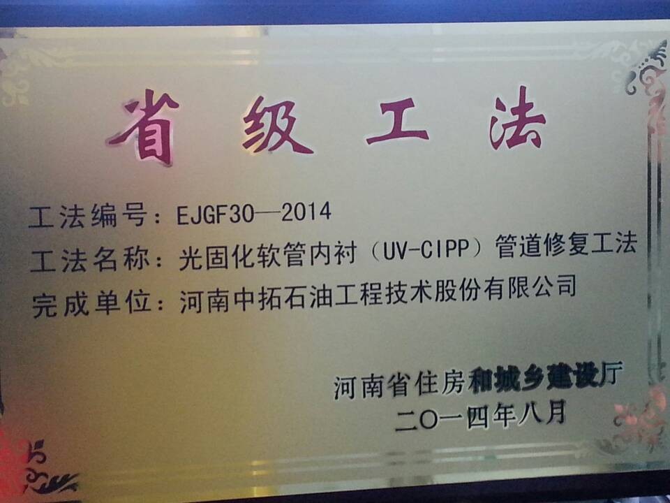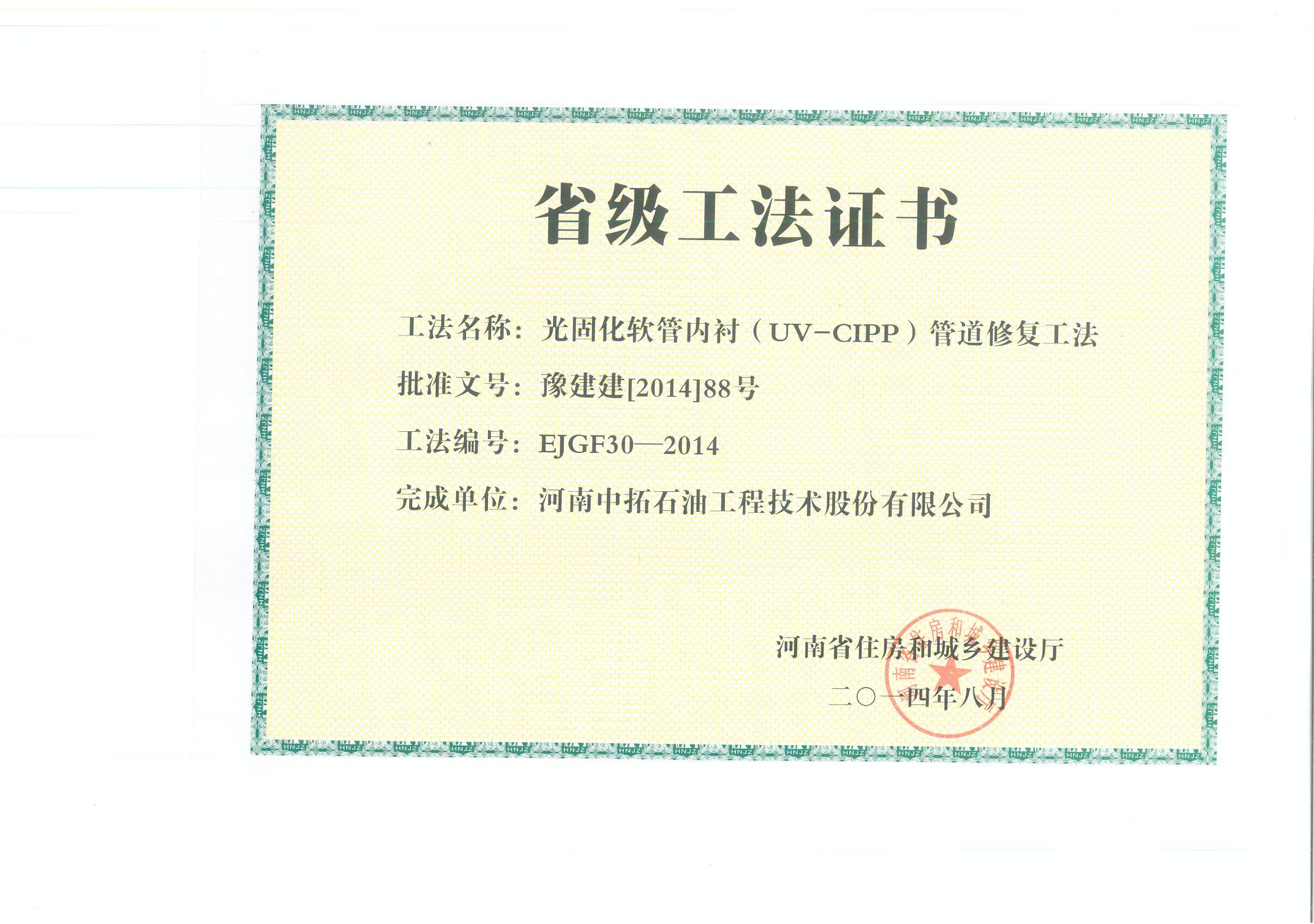 经河南省住房和城乡建设厅组织专家委员会评选、评委会审议并经网上公示,我公司获得一项河南省省级工法,工法名称为“光固化软管内衬(UV-CIPP)管道修复工法”。上述工法的获得,表明公司的科研成果得到了政府部门的充分肯定和认可,展示了公司管道修复的科研实力,同时为今后继续申报国家级工法做好准备,为申报政府科研项目、科技品牌建设再添科研成果奠定基础。