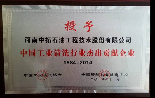 在2014年11月14日结束“第十四届全国清洗行业技术进步与清洁产业发展论坛”中,公司荣获“中国工业清洗30年梯队建设优秀企业”和“中国工业清洗行业30年杰出贡献企业”奖牌。