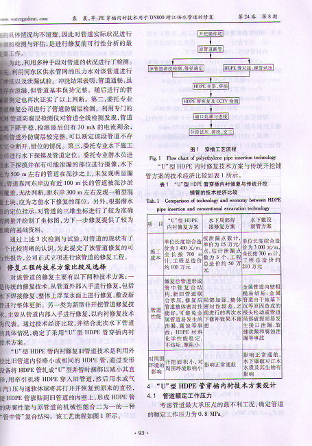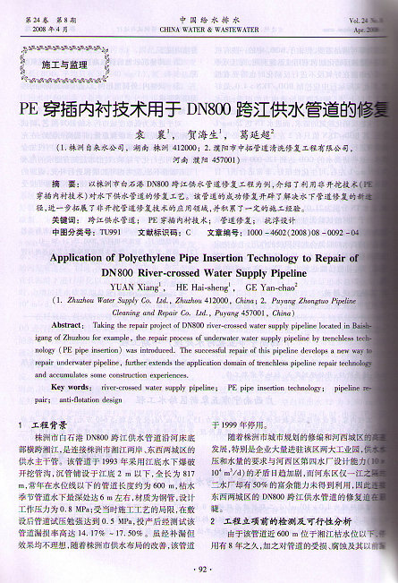 文章题目为《PE穿插内衬技术用于DN800跨奖供水管道的修复》,其文章中主要介绍了在穿插修复大口径管道的施工方式、技术举措和施工过程等。