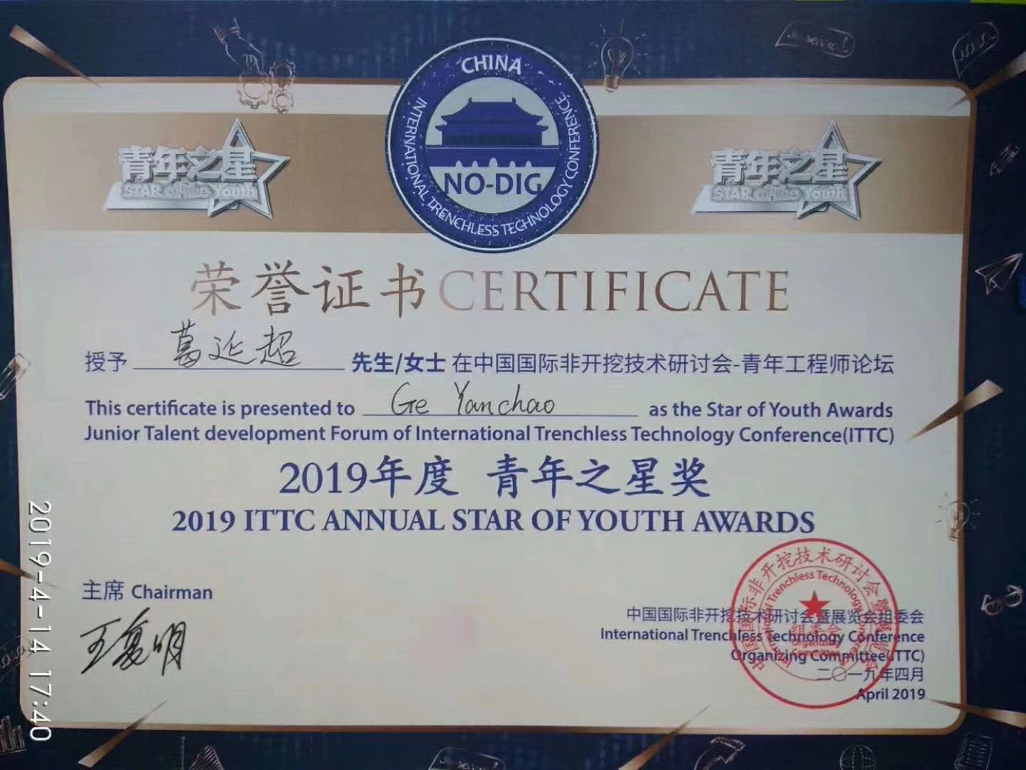 祝贺我公司总工程师葛延超先生获得中国非开挖协会唯一的青年之星称号!
